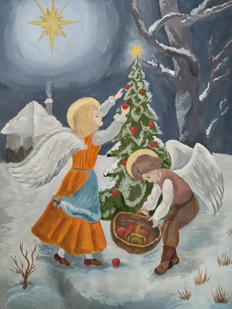 Каждый рисунок передаёт особую атмосферу рождественских праздников, морозного воздуха, блеска снега и тёплых огней. Это живое отражение детского видения зимы и праздничного настроения.