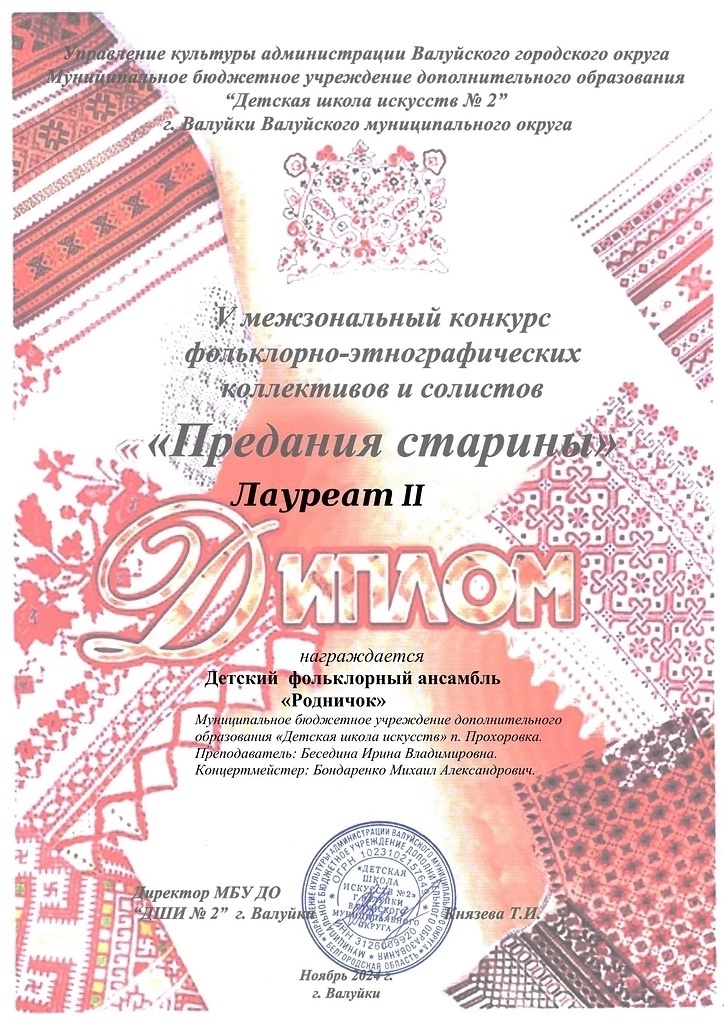 Детскую школу искусств п. Прохоровка в дистанционном формате достойно представила учащаяся класса фольклорного пения Алла Бондарцева. Под руководством своего преподавателя Ирины Владимировны Бесединой и концертмейстера Михаила Александровича Бондаренко юная вокалистка подготовила сложную конкурсную программу, за которую была удостоена звания Лауреата III степени.